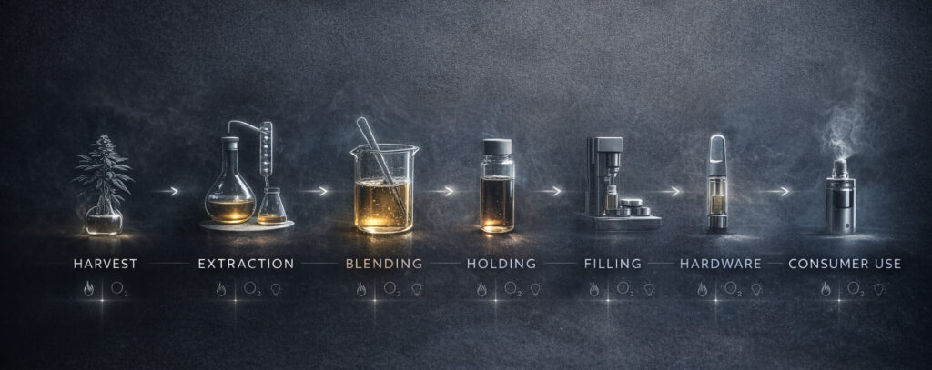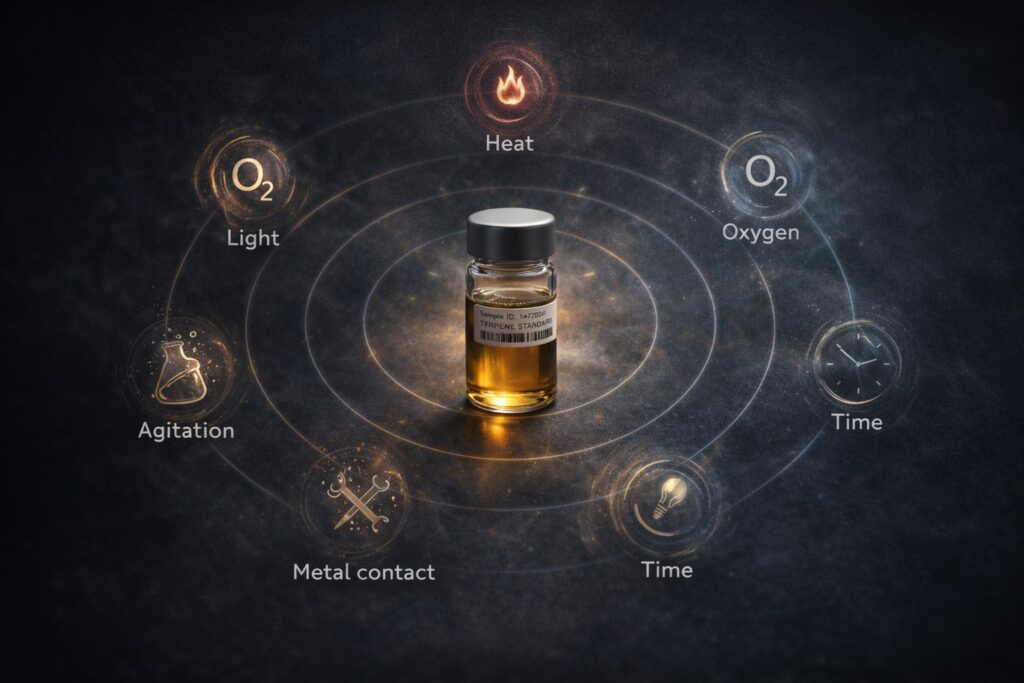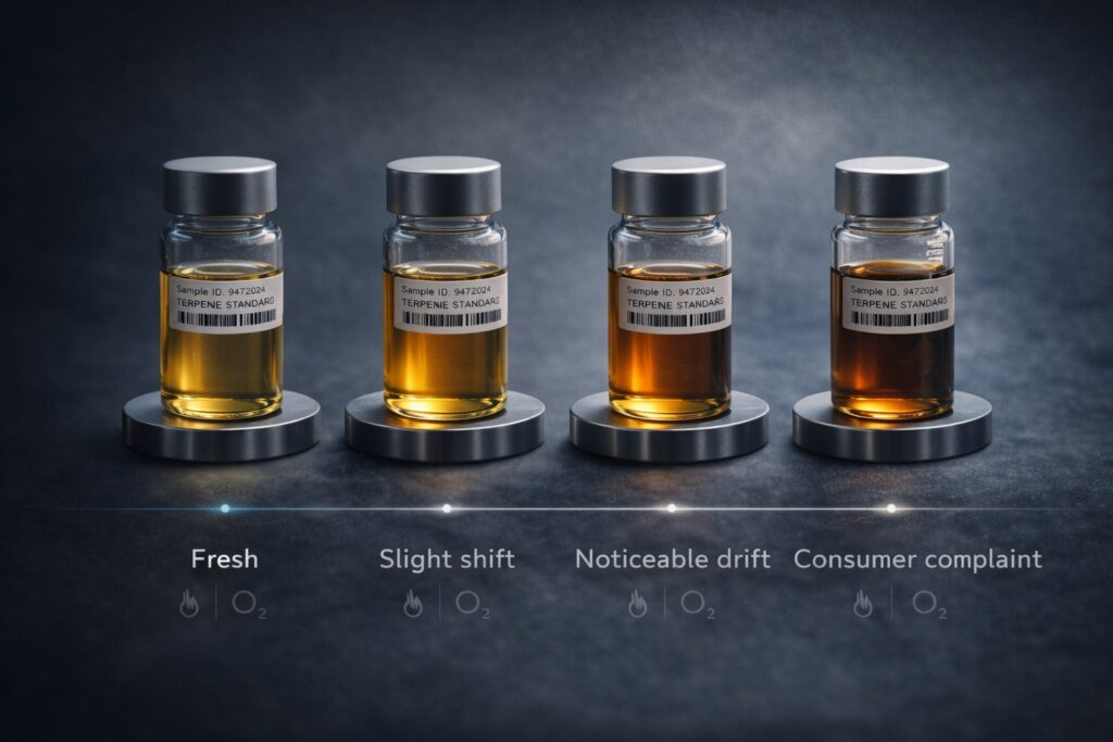 Terpenes are highly sensitive to oxygen. Even small amounts of air exposure during blending, filling, or storage can initiate oxidation.